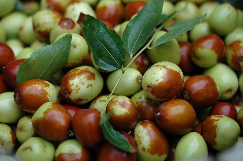 枣(学名:Ziziphus jujuba Mill.),别称枣子,大枣、刺枣,贯枣。鼠李科枣属植物,落叶小乔木,稀灌木,高达10余米,树皮褐色或灰褐色,叶柄长1-6毫米,或在长枝上的可达1厘米,无毛或有疏微毛,托叶刺纤细,后期常脱落。花黄绿色,两性,无毛,具短总花梗,单生或密集成腋生聚伞花序。核果矩圆形或是长卵圆形,长2-3.5厘米,直径1.5-2厘米,成熟后由红色变红紫色,中果皮肉质、厚、味甜。种子扁椭圆形,长约1厘米,宽8毫米。