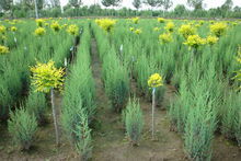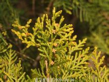 2、金叶桧(cv.Aurea)栽培变种,植株呈直立窄圆锥形灌木状,全为鳞形叶,新生也全部为金黄色。直立灌木,鳞叶初为深金黄色,后渐变为绿色。