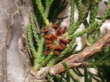 2、山田胶锈菌桧柏染病后,在小枝一侧或周围形成直径3至5厘米的瘿瘤。病部呈黄色,起初表面平坦,至春季,菌瘿中心隆起破裂,露出深褐色鸡冠状的冬孢子角。冬孢子角遇雨吸水膨大,呈胶质花瓣状。桧柏受害严重时,小枝枯死。